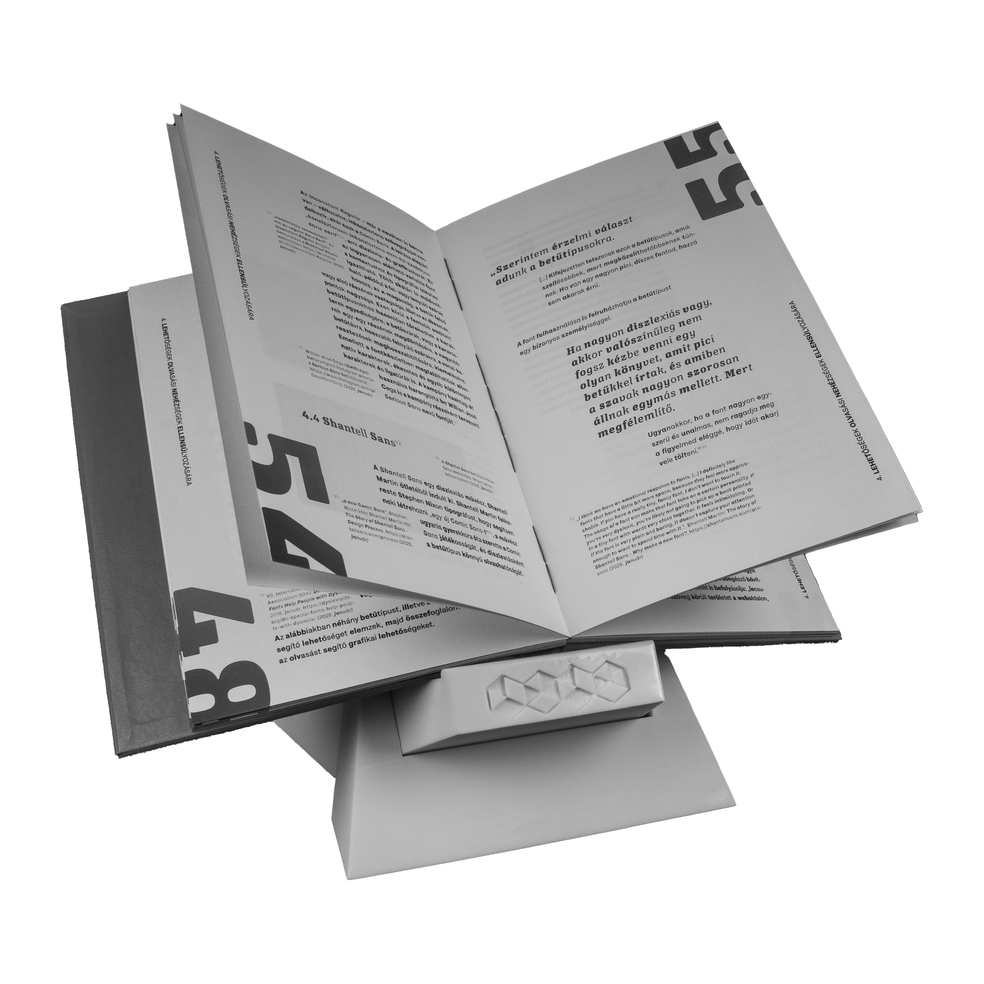 For the designed thesis book, I did the bookbinding and for the installation of the book I also designed a 3D printed bookstand. I used the Bionic Reading font for the main text in my book. The debossing on the front cover of the book and the pressable craft foam layer in the back cover allows this book to become an anxiety-relief fidget object itself, connecting it to my master’s work (FIDGETYPO).